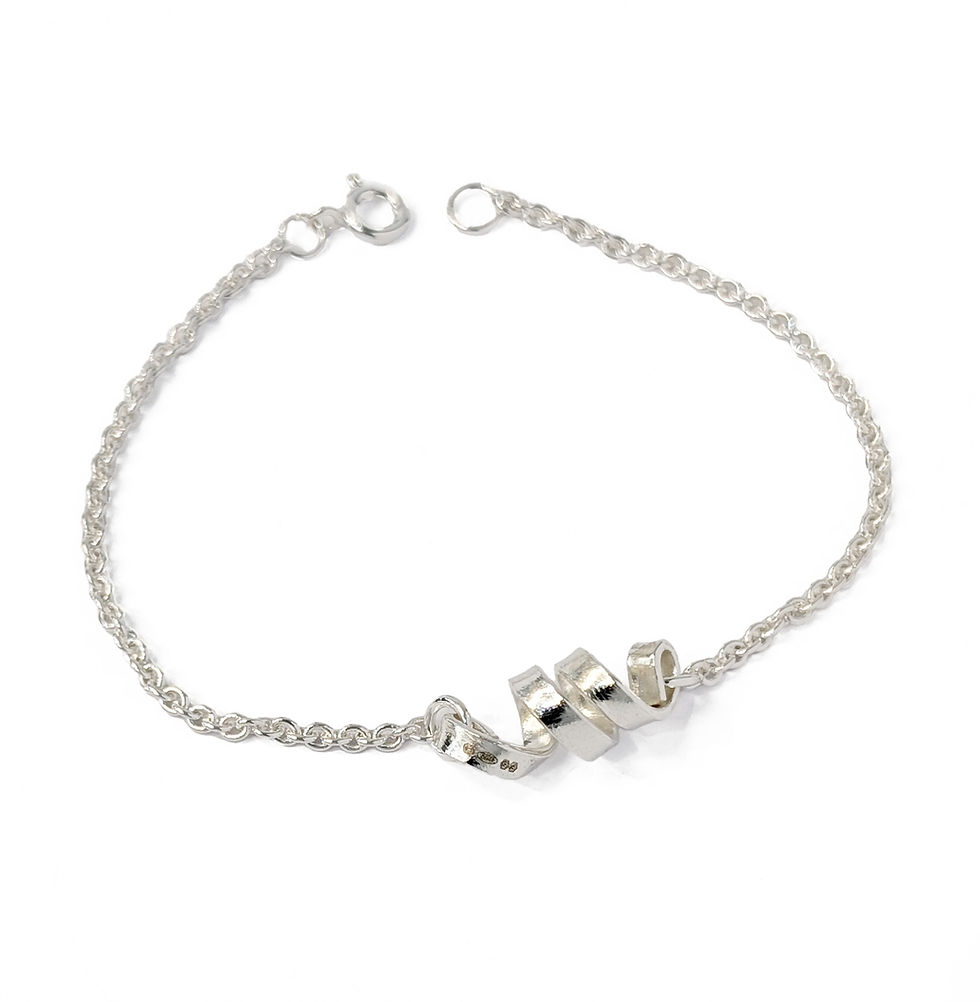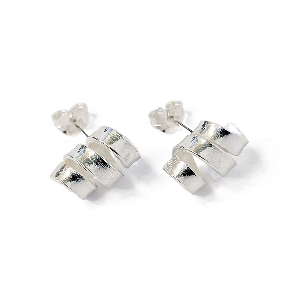 The Spin collection is made from textured strips of silver which are hand formed. Every spin is completely unique so no two pieces are the same. Keeping her pieces three dimensional they really come to life when worn and make a strong statement.